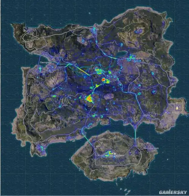 可能是新地图较老地图来说资源更加丰富的原因,Miramar的热力分布图较为均匀。Pecado和豪宅始终保持跳伞圣地的地位。沙漠地图的资源分配使得沙漠地图的打法具备了多样性。