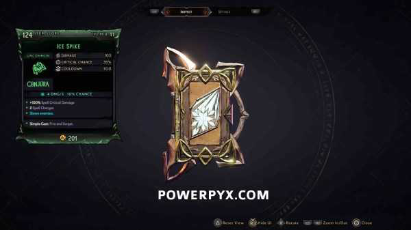 最后装备两个法术,可根据个人喜好来选择。个人推荐【冰锥】,每只手都有2次充能,由于我们是双持,总共就是4次(左手2次;右手2次)。推荐原因是它很容易造成+100%法术暴击伤害(或更高),因为我们加点全部选择了【敏捷】来换取暴击率(30敏捷等于+40%暴击率),并且还有被动【法术狙击手】提供的+60%暴击率,也就是说基本上每次攻击命中都会触发暴击,双持法术可以同时从左右手射击。