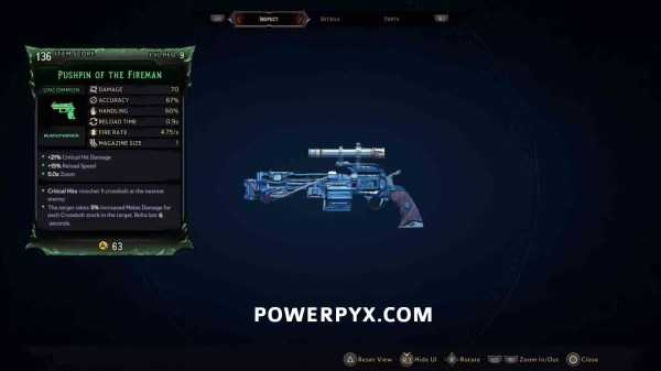 如下图中所示,此手枪的重新装填时间只有0.9秒(并且被动点了【魔法伎俩】还能额外减少40%),并且弹匣容量只有1,也就是每次射击前都会自动重新装填子弹,无需手动装弹,这样也同时减少了操作。对于9级武器来说,伤害也还不错(不过这一点不重要,对此Build来说武器只需要看重新装填时间即可)。
