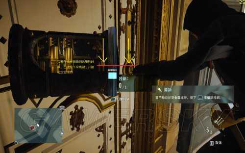 最近我《刺客信条:大革命》主线做的不多,开始四处做支线,那些四处散步在地图各处的红箱子,是需要开锁才能打开的,这些箱子分成三个等级,需要有对应的开锁技能才好打开。其中1级开锁技能去开2级的箱子是很困难的,同理,2级开锁技能开3级箱子也是不推荐的,我这里的开锁技巧,前提就是把开锁技能的等级升级到和要开的箱子一样即可。3级开锁技能需要9个技能点,完成序列9才行,如果不想修改的话,那么这里介绍一个方法:先观察横杆的移动方向和蓝色区域的所在位置,如果蓝色区域是在锁栓偏下的位置,那么就等那个横杆,往下走到图中红线所示的位置的时候,迅速按下开锁键(PC版默认是按空格)即可;如果蓝色区域是在偏上位置,是等横杆往上走到蓝色区域以下的相同距离位置即可: