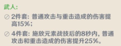 A:首先可以选择“武人4件”(2件套增加普攻/重击的伤害,4件套在释放元素战技后再次提升普攻/重击的伤害);也可以选择的“战狂4件”(2件套增加暴击率,4件套当生命低于70%时额外增加暴击率),以此来弥补前期暴击率的不足;当然也可以选择“武人2件+战狂2件”这样的穿插搭配。