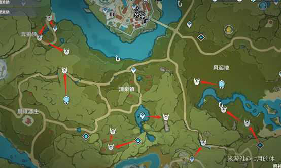 由于丘丘人太多了,就不一一例举了,这里“七休”标了一些富集丘丘人的地点的一部分。建议等级低的打蒙德璃月的丘丘人,血量低,也没啥大怪干扰你跑图,环境没那么恶劣