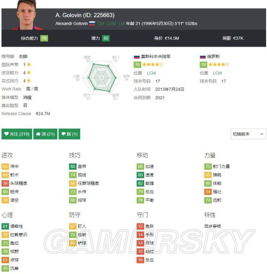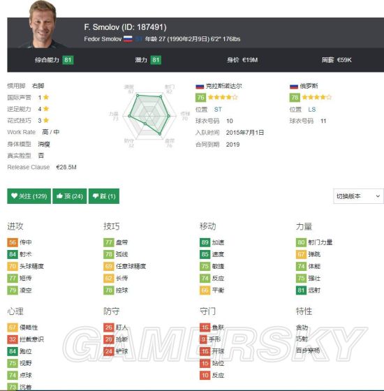 现役俄罗斯队中有一位多面手,那就是戈洛温,各方面都比较不错,也踢过很多位置,左边前卫、中前卫、后腰,他都能胜任,在俄罗斯世界杯上戈洛温是不可或缺的一个点。游戏中的戈洛温同样是俄罗斯套极为突出的球员,真正意义上的哪里需要哪里搬。数据上的全面不能弥补其模型上的短板,强壮和体重都不够,如果想要踢中路,需要做好被博格巴这种类型球员欺负的准备。