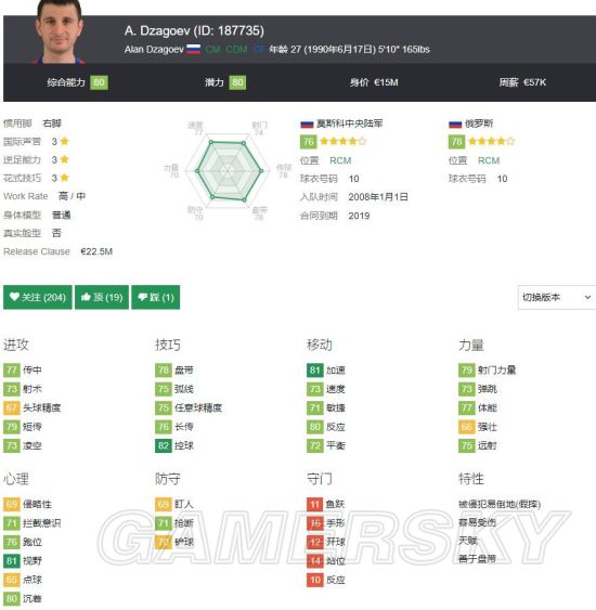有“老沙皇”就有“新沙皇”,阿尔沙文后俄罗斯进入了扎戈耶夫领衔的时代,这位在2012年欧洲杯大放异彩的少年现在却有了一丝伤仲永的味道,本应很早加盟欧洲豪门,却在莫斯科中央陆军失去了机会,本届世界杯,扎戈耶夫能否找回2012年的表现呢?游戏中扎戈耶夫只能说是差强人意,丝毫看不出曾经的强势,作为边路速度不够快,作为中路身体素质有限,难以完成防守任务,想要使用他的玩家要好好斟酌一下了。