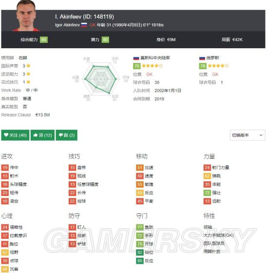俄罗斯历史上最伟大的门将是谁?玩过FIFA OL3的玩家都知道,列夫-雅辛,这位门将被世人称作“黑蜘蛛”,夸张的臂展,出色的门线技术,同样现在的俄罗斯门将阿金费耶夫也有出色的臂展,扎实的门线技术。在游戏中一样好用,有不错的扑救能力,如果有想法的玩家可以试试。
