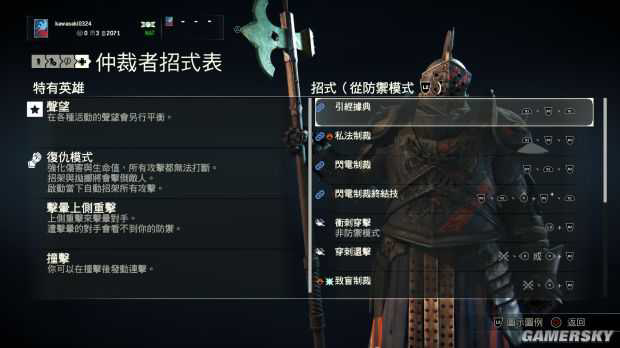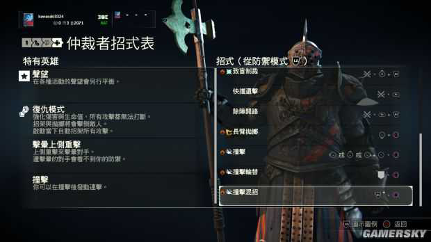 分析:仲裁者单挑要依靠精力消耗,格挡后可接撞击,效果比征服者优势格挡更加优势,因为除了打断重轻击,还有精力消耗和连招启动。所以不要抡着长戟冲过去送招架,多用上轻击和闪避撞击,不断向前推进给敌人压力。