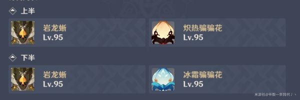 太简单了没啥说的,尽量温迪在上半下位替代砂糖或琴,注意要打完的时候控一下能量让每个角色都有元素爆发即可。