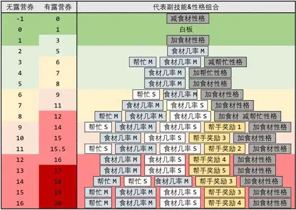 *上图中,左侧两列分别为无露营券及有露营券下的组合等级,右侧一列为在该组合等级比较有代表性的副技能&性格组合。
