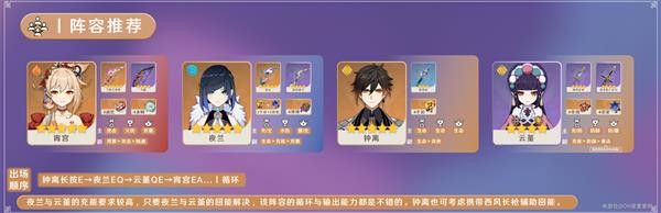 长野原烟花店的店长——宵宫,擅长攻击落单的魔物,以平A为主的她,甚是喜欢云堇的飞云旗阵助力,钟离驱动岩之力唤得玉璋护盾为其庇护,后有夜兰掷出玄掷玲珑,协助其进行战斗,宵宫在挚友们的鼓励与配合下,势如破竹之气势,过五关斩六将之气概。