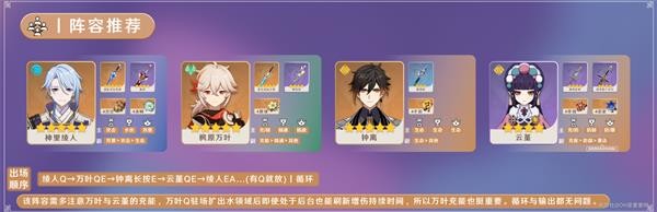社奉行神里家的家主——神里绫人,吾兄也甚是喜欢云堇的飞云旗阵,进入泷廻鉴花状态后,平A便会爆发出不俗的威力,此时有云堇的飞云旗阵、钟离的玉璋护盾、万叶的风物之诗咏助力,便会蓄势待发之势,一鸣惊人之叹。