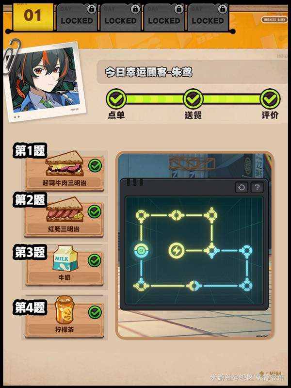 《绝区零》当三明治来敲门活动中玩家需要为被选中的幸运顾客们提供服务,第一天的幸运顾客为朱鸢,那么活动第一天要怎么玩呢?下面请看由“绝区零情报布”为大家带来的《绝区零》当三明治来敲门第一天活动攻略,希望对大家有用。