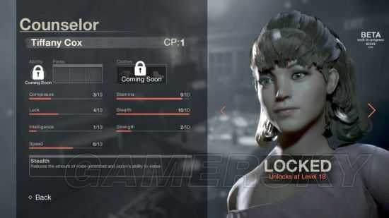 这边顺便讲一下,《十三号星期五》角色之间的属性差蛮多。黎明杀机把角色差异做在天赋上面,这款把角色差异做在基础数值上,有分镇定、力量、智慧、幸运、耐力、速度、潜行。