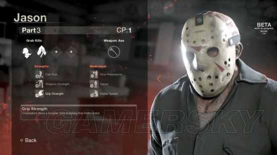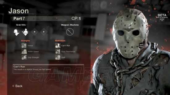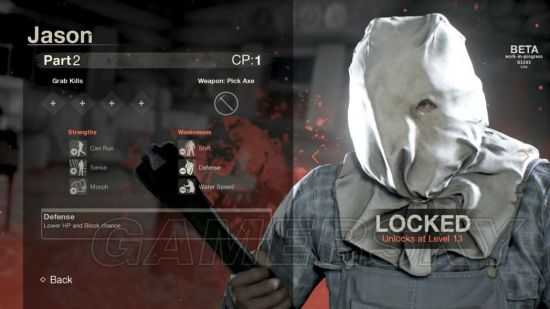 杰森到后来才开始带面具,因为是溺死的,所以杰森在水里移动速度较慢,这个也有做出来,我觉得很有心(闽),他穿的衣服、裤子这些也都是跟电影一样。后来电影有一集,杰森因为杀不死,主角们用锁链绑住石头,把杰森丢回水晶湖,面具也被砍破。这游戏也有做出来,也是一只不同的杰森角色。因为后来杰森又从湖里面爬出来,这表示你选这只杰森的话,在水里移动比其他杰森快,但是没有办法在路上跑步。