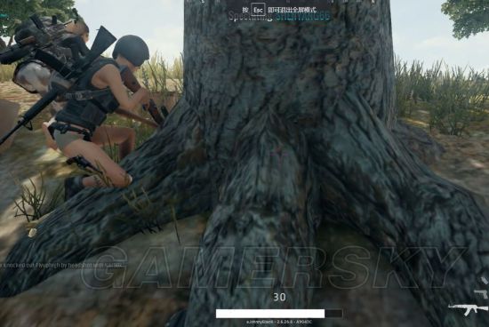 在经典地图里有很多的树木模型,有些树木的树根的模型比较大,我们可以直接趴着躲在里面,自己给自己做一件吉利服。
