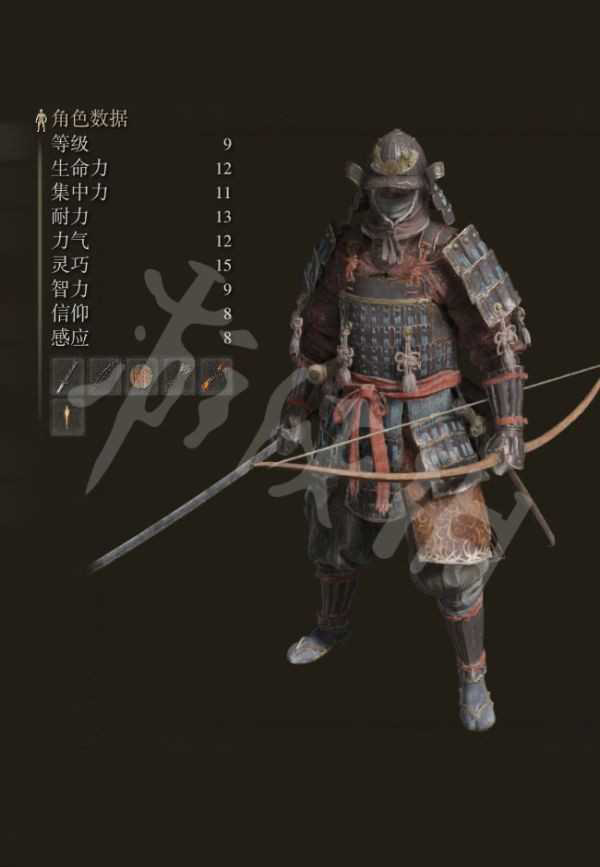 除了智力、信仰、感应外,其他属性较为均衡。初始武器【打刀】战技为【居合】,和其他武器的架势技能类似可以进行快速斩击造成较高的伤害,同时【打刀】也附带流血效果。而初始的长弓战技通过拉满蓄力能打破敌人的防御。