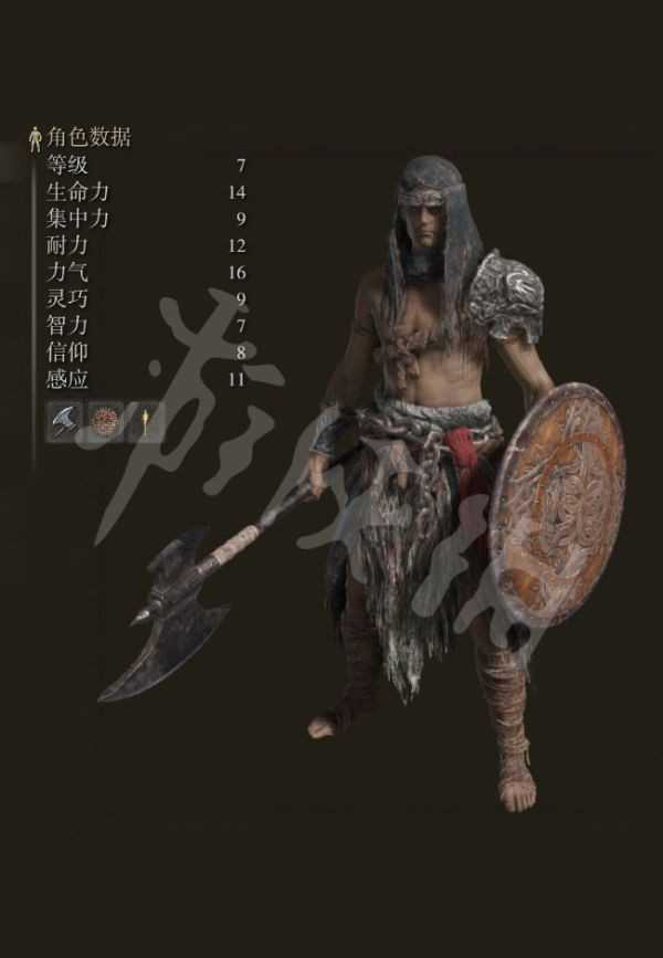初期有着较高的力量加成,能够更快的装备一些力量需求较高的武器或盾牌。但是初期的灵巧、智力、信仰属性较低,所以前期想要使用这些武器、魔法就意味着需要投入较多的属性点数。