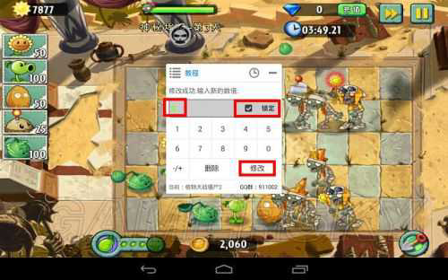 完成了第一步后,尽量种更多的植物,防止ganme over。第一次不要搜索0,等到吃到第一个能量豆后,葫芦侠的小图标,搜索1,然后返回游戏。注意:不用勾选那个改阳光的选项。