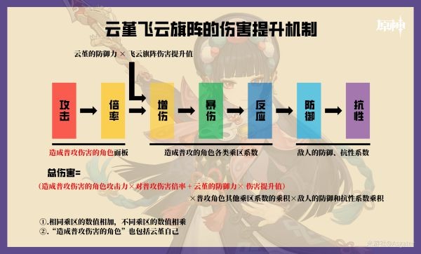 “单次普攻的总伤害=(造成普攻的角色攻击力×对应普攻倍率+云堇的防御力×飞云旗阵伤害提升倍率)×释放普攻的角色的增伤、暴击、反应的乘区系数乘积×敌人防御、抗性系数乘积”(如下图)
