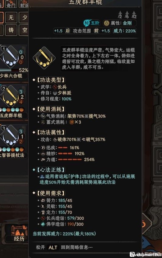 正逆群羊棍,效果可以在护体技能中释放,加速一半释放条,并且免提气/架势的消耗。