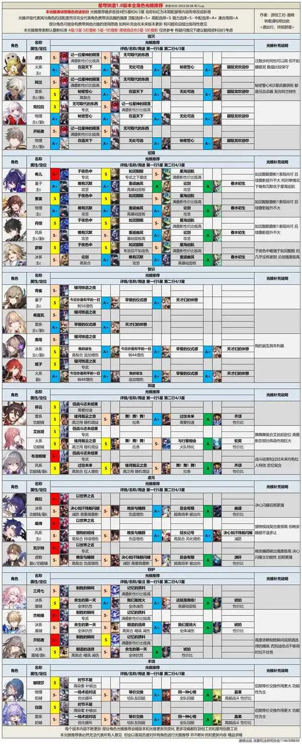 本期是开服后第一版全角色光锥攻略,未来也会根据版本趋势、环境走向以及配队思路等方面不断更新完善攻略内容,希望本篇攻略能够叫好且叫座。