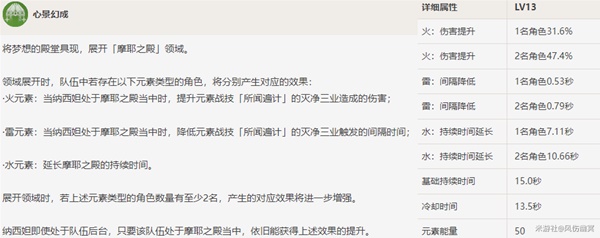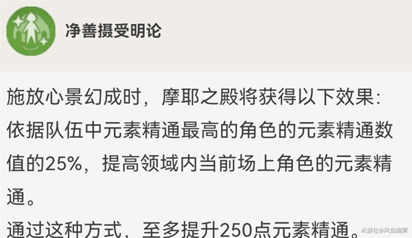 开大招后根据队伍里「元素精通最高的」那个角色的25%提高领域内角色的元素精通。
