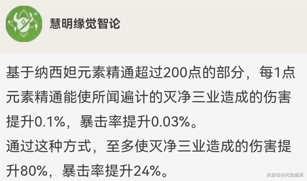 超过纳西妲200点的精通提升E技能标记后的「灭净三业」的伤害以及暴击率。