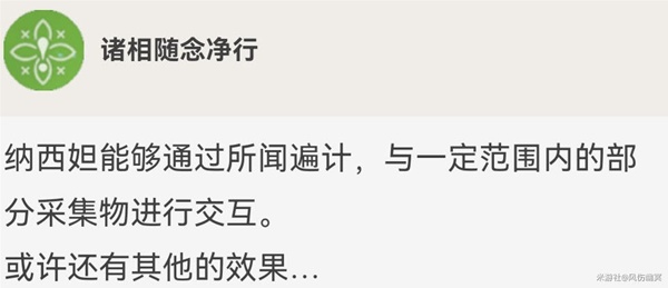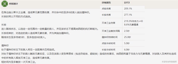 中招的怪会在我方「触发元素反应」时受到一个叫「灭净三业」的草伤,并且「被标记」的敌人在一定距离里有「连锁触发」的效果,也就是说打一个被标记的人触发反应后,其他被标记的敌人即使没被触发反应打到也会造成「灭净三业」的草伤。