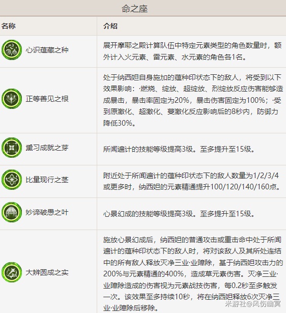 六命开大招后纳西妲的普攻和重击对处于「被标记」状态的敌人会根据纳西妲攻击力和精通的高低触发「草伤」!!最多6次!纳西妲的速切命座。