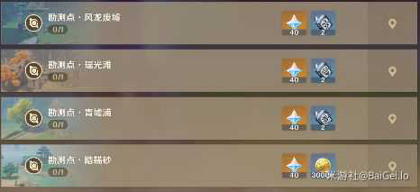 前期一共有四个勘测区域,每个勘测区域包含四个点位,四个点位分别为宝箱、怪物、无法使用的机关、通用型定向传导元件,共16个点位,点位已经标注在下图。