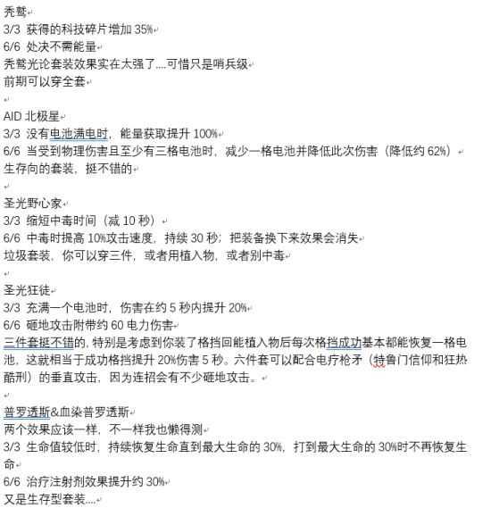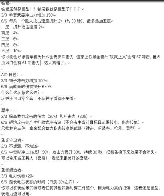 《迸发2》装备套装后会有特殊的状态效果,会提升玩家的能力,可能还有些玩家不知道具体套装的装备效果,下面带来玩家“盐重失误”分享的《迸发2》全装备套装效果一览,希望能帮到各位玩家。