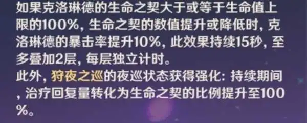 像刻晴大招一样在较大范围内造成多段雷元素伤害,伤害可观,且会直接为克洛琳德赋予一定生命值上限的生命之契。