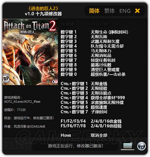 《进击的巨人2》中有些章节和任务的难度较高,许多玩家选择使用修改器来简化难度。那么修改器该如何使用呢?今天就为大家分享一篇“风灵月影”介绍的《进击的巨人2》十九项修改器及使用方法说明,希望对大家有所帮助。