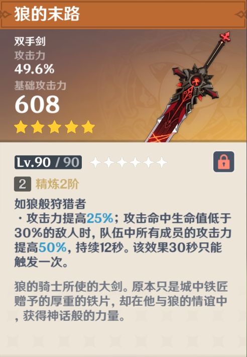 常驻四星大剑,唯一提供精通的四星大剑,满精炼可提供36%的增伤,配雷神可以有很好的发挥,输出也很可观,但是36增伤还不足以碰瓷狼末,圣遗物推荐攻风暴。