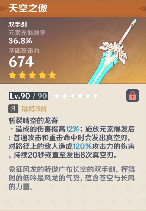 同样作为常驻的五星大剑,天空的特性有点不尽人意,提供充能,一点点增伤,释放元素爆发后普通攻击附带一道空气刃(物理伤害),无论早柚是站场输出还是速切脱手输出都用不上普通攻击,充能在有需求的时候确实是个有效词条,实在是缺充能也不是不能用,但是伤害感人,一般不作推荐,圣遗物攻风暴或者精风暴,跟班尼特或者九条裟罗配队时选择精风暴。