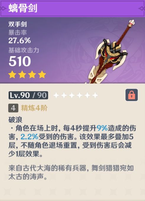 仅能通过解锁「珍珠纪行」获取,提供一定暴击率,满精炼最高提供50增伤,速切脱手打法可以比较容易保持5层被动,大部分情况下精炼3以上期望就可以追上精炼1的狼末(不计算狼末的触发型被动),考虑到狼末的触发型被动,一般精炼4以上根据自身圣遗物的双暴比例去选择带哪个(选择双暴比例接近1:2的)圣遗物精攻暴或者精风暴(配队上有攻击拐时)