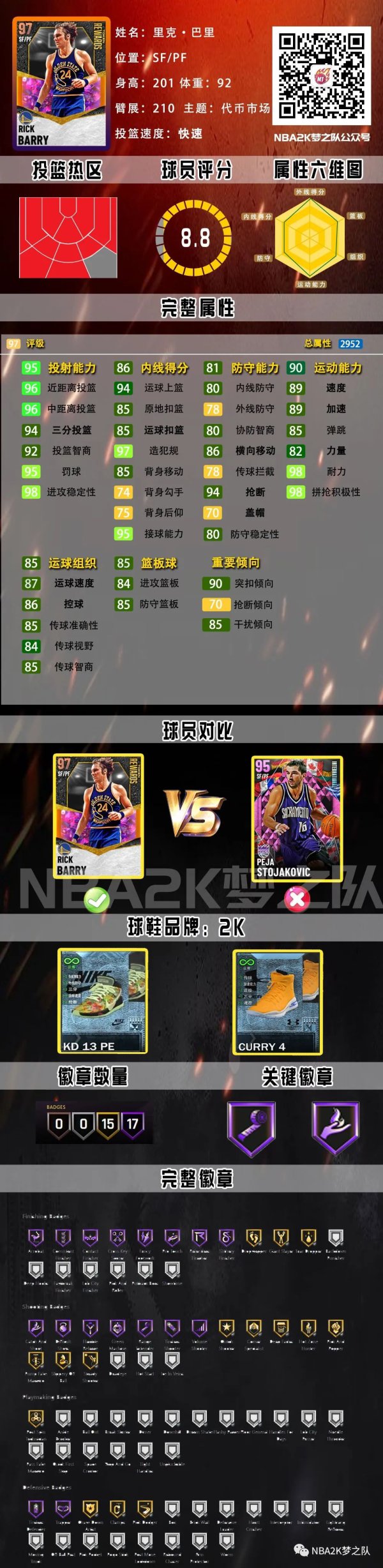 先来看罚球动作是“蹲尿盆”的里克·巴里,这张卡有着精英级别的投射能力,其投篮平均值都高达95,而且自带最强的远程炮台紫章,应该是仅次于伯德的锋线投手了,而且巴里的其它属性也不算太差但也不突出,还没有第一步徽章,必须要补上。
