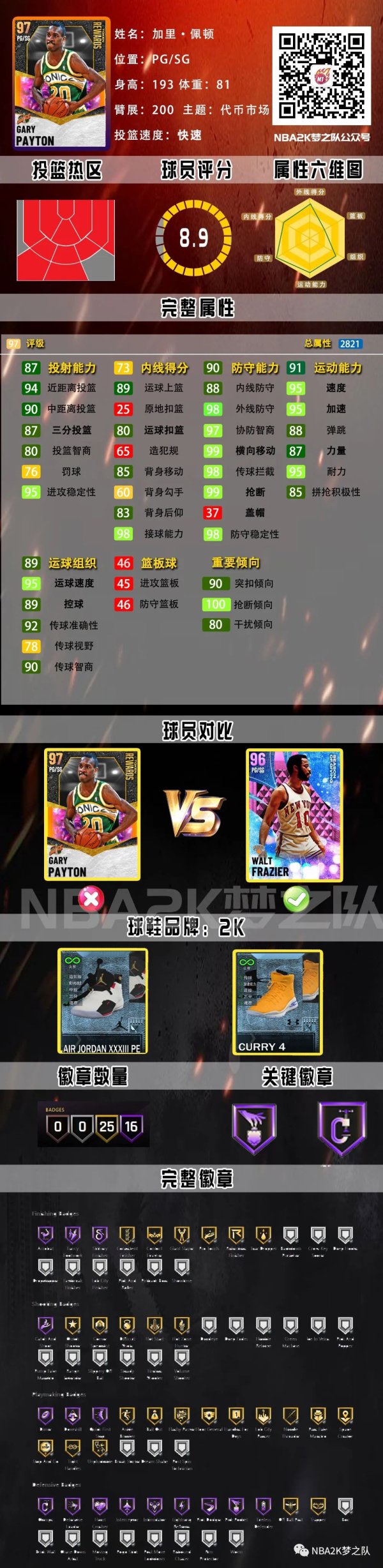这张银河手套同样是个以防守起家的球员,他的防守属性简直华丽到爆炸,横移和抢断均为99,防守紫章也很丰富,而且1米93的身高在现阶段也是很好的。不过这张佩顿的进攻属性还是一般,无论投篮还是扣篮都只能算普通,明显的守强于攻,其特点我觉得跟粉钻弗雷泽非常类似,所以个人认为750代币换佩顿有点不值。