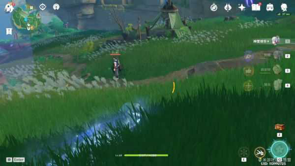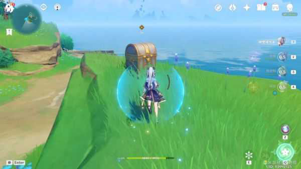 发现了这个特点以后,我切换了刻晴,在原地留下一个标记以后,回头下坡,在宝箱解锁的瞬间闪现回去,解锁了这个宝箱。