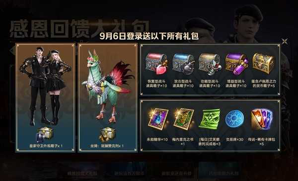 这一份感恩回馈礼,9月6日新版本上线后,冒险家们记得在游戏内【活动中心】领取。