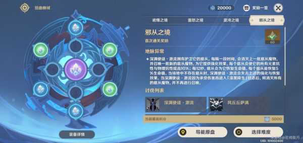 本次更新后,挑战过混沌之境任意难度的旅行者们可以直接挑战邪从之境,邪从之境中真正需要讨伐的目标仅有一个深渊使徒·激流,但是受到地脉异常的影响,深渊使徒每隔一段时间会召唤一群怪物协同作战,每个被召唤的怪物都会给深渊使徒提供额外10%物理及元素抗性,并使深渊使徒获得最大5%生命上限的回复效果,当深渊使徒生命过低进入[漆黑降生]状态后,会消灭场上所有召唤的怪物并不再召唤……总体来说是个相当难缠的buff,大量怪物提供双抗及回复,使得这个秘境对于练度需求非常高……