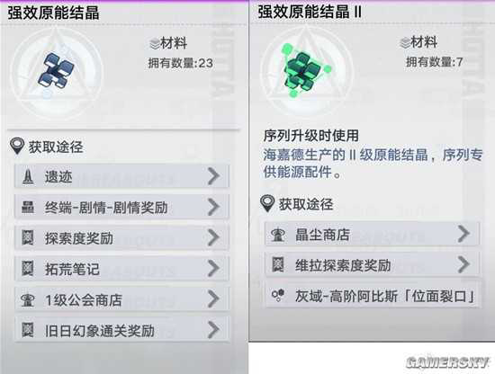 源器的升级目前需要两种材料:强效原能结晶与强效原能结晶II,在升级到不同等级需要不同的条件,例如等级与GS【战力】升级前可以系统查看下。