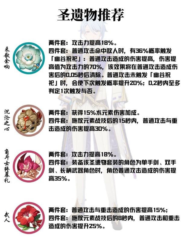 ①武人:作为四星圣遗物,2件套普通攻击造成的伤害提升15%,4件套施放元素战技普通攻击造成的伤害提升25%,是绫人很好的过渡圣遗物