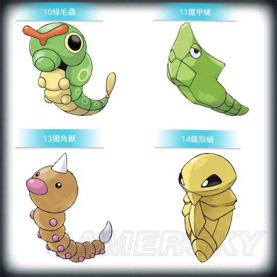 绿毛虫、铁甲蛹、独角兽、铁壳蛹。