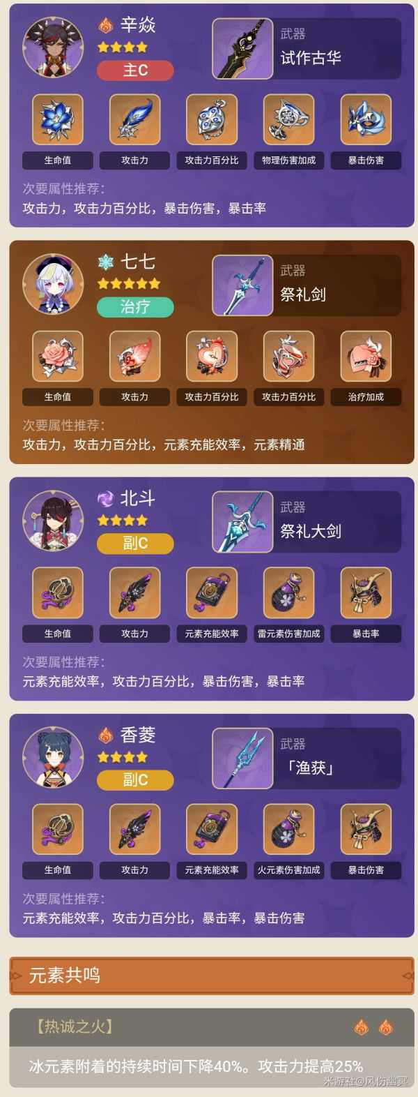 七七超导减物抗,回血。香菱补伤害,上火。北斗大招可以被重击触发,又有盾又减伤又抗击打,快被攻击时还能弹反。是比较协调的配队,全部开大招,然后辛焱重击,全部都刚刚好。