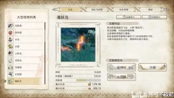 《怪物猎人崛起》中毒妖鸟是一只难度较低的怪物,一般在游戏主线的早期就会出场,它的大小金尺寸是多少呢,下面请看“拉弓不放箭”带来的《怪物猎人崛起》毒妖鸟大小金攻略,希望能够帮助大家。