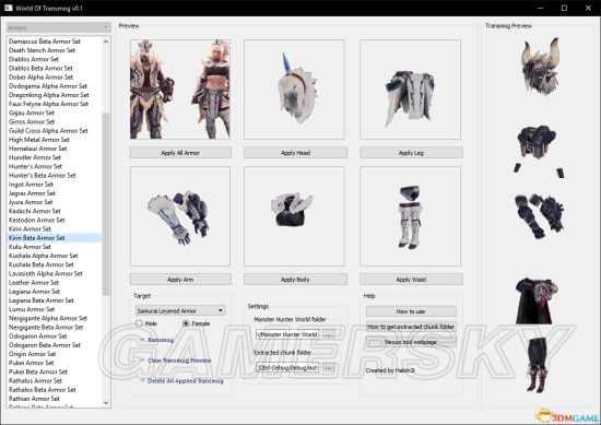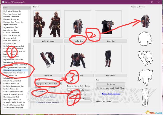 3.使用方法,位置设定好以后,比如说,我想把灭尽龙β头换成惨爪龙α,那就先找到惨爪龙α套装,选择头盔,然后在第一栏下面选择灭尽龙β套装,然后“tramsmog”,即可替换成功。