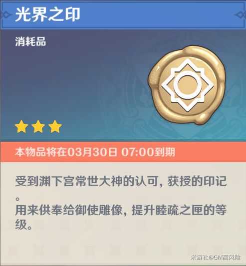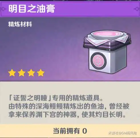 参加限时活动「三界路飨祭」获得,探索冒险获得「光界之印」,供奉「御使雕像」、升级「睦疏之匣」,当「睦疏之匣」等级分别为5、9、10、14级的时候,就可以获得限定四星法器-证誓之明瞳的精炼材料-明月之油膏