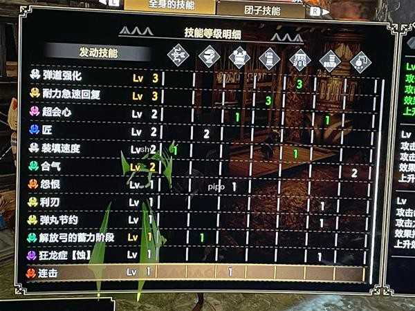体术只要出到四搭配二级体术猫饭即可达上限,其他输出基本基本出齐,而弓箭和狂龙症这个技能的相性可以说一级棒了,副作用基本不存在,而且克服时是回复所有红血即使不是狂龙症造成的,很多时候可以硬着刚不用断节奏喝药,而且一级狂龙症收益极高值得为他放弃妃蜘蛛腿,狂龙触发同时可以触发冥渊部件自带的怨恨,天回腿送的节弹蚊子腿对于弓箭也算蚊子腿加强。
