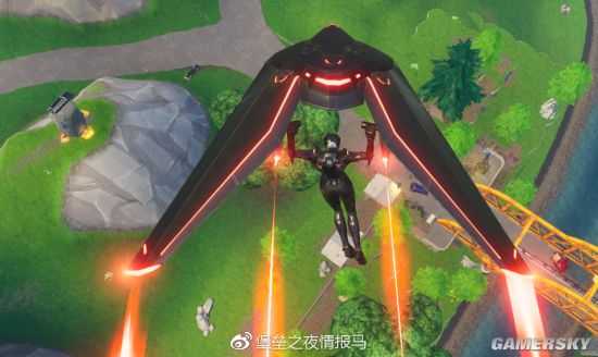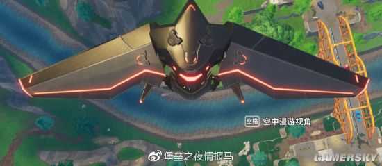 要是说之前测评的伺服系统(直升机)属于是近现代的飞行器的话,那今天介绍的这降落伞他就是属于未来科技类的飞行器。大小不是很宽但是比较长,一天橙色的发光条贯穿机翼,机头以及机身前部都是有碳纤维纹理作为装饰(不得不说堡垒之夜纹理方面做得很好)看一下整体一个回旋镖的造型配上这些科技感十足的元素,十分炫酷。得分7.5分