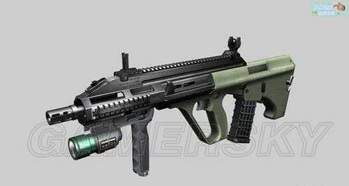 AUG突击步枪集无枪托,塑料枪身、千里眼、模块化四大优点于一身:易携带、耐腐蚀、使用寿命长、配备高倍瞄准镜、模块化的部件设计方便拆卸。AUG是一种把以往多种已知的设计意念聪明地组合起来,结合成一个可靠美观的整体。